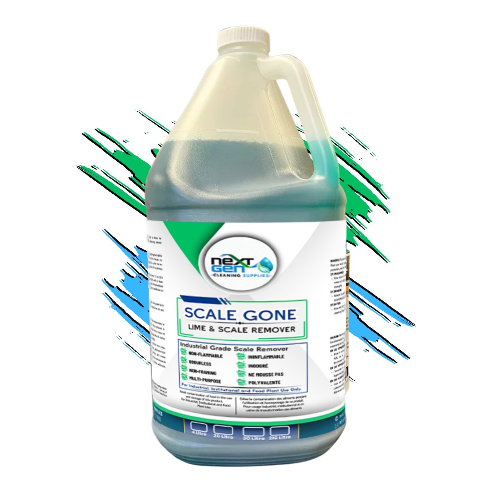 Scale Gone is a liquid all-purpose acid descaling solution. It is formulated using safe acids to allow for maximum effectiveness on stainless steel and glass surfaces. NextGen Scale Gone is low foaming, blends readily with water, and is non-fuming.